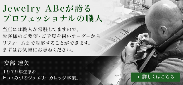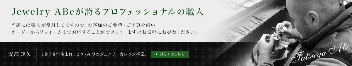 大分では数少ない職人常駐の店として、当店ではお客様のご要望を最大限実現するために、職人と一緒に加工についてのお話をしながら作業を進めていきます。職人は一人なのでお時間はかかりますが、必ず満足のいくものを作っていきます。 また品質についても、特にダイヤモンドと真珠には自信があります。ダイヤモンドでは大きさよりもエクセレントカットやハートアンドキューピットのカットのきれいなものを、真珠ではテリ・つやがよいものを通常商品や加工用材料としてご提供しております。