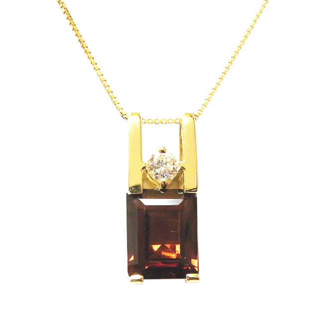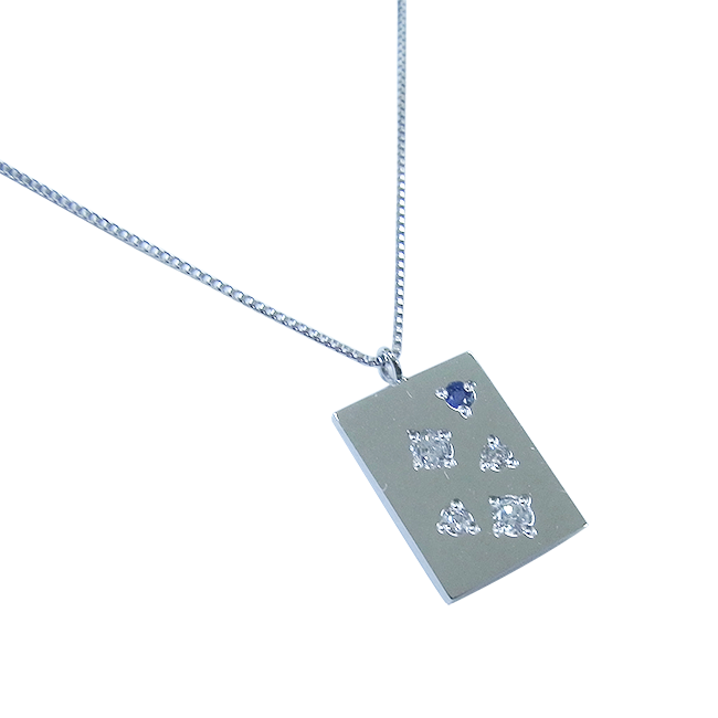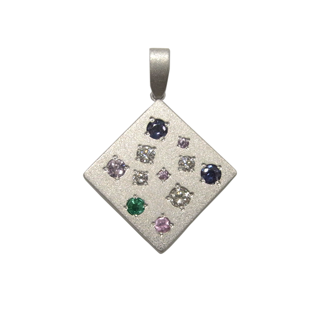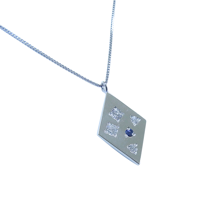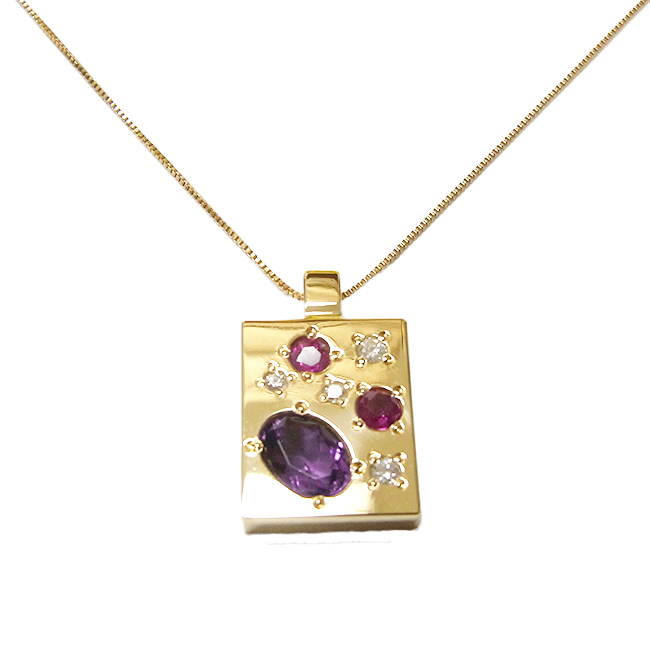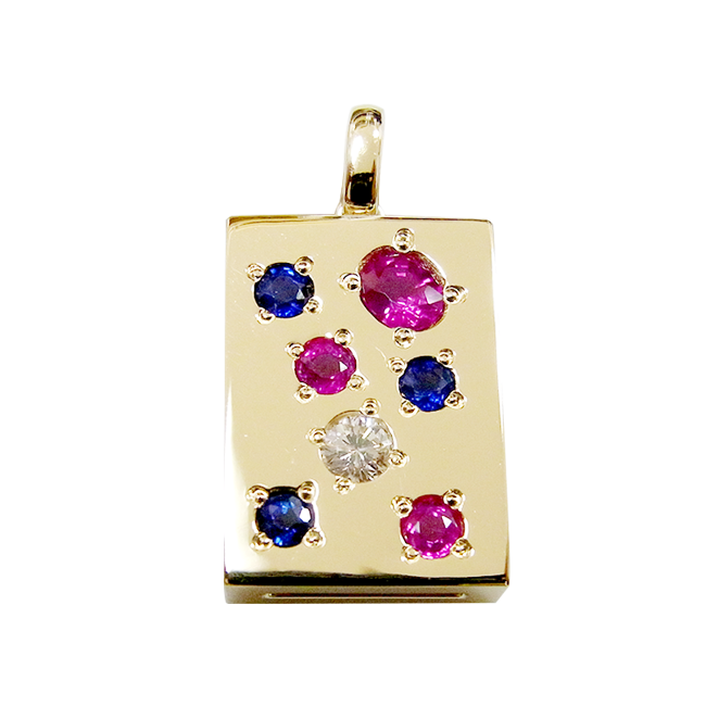 お客様の持っていた小さなダイヤにそれより大きいダイヤやカラーダイヤを合わせてプレート状の地金に埋め込んだペンダント