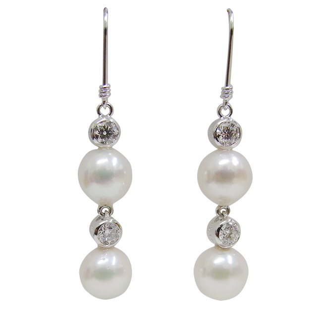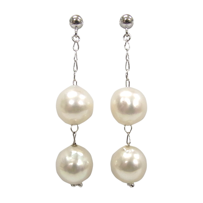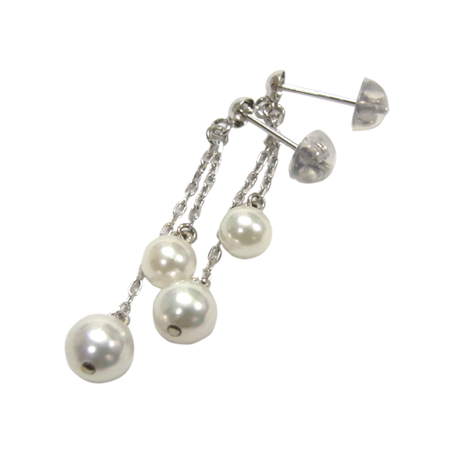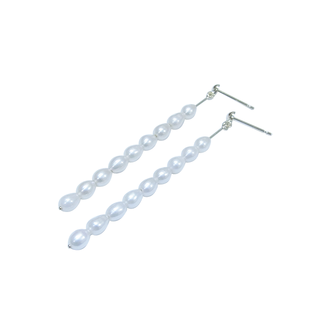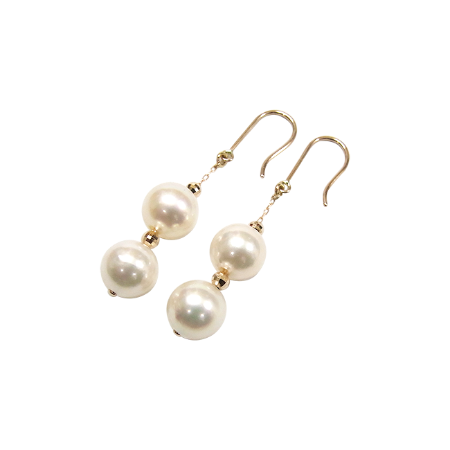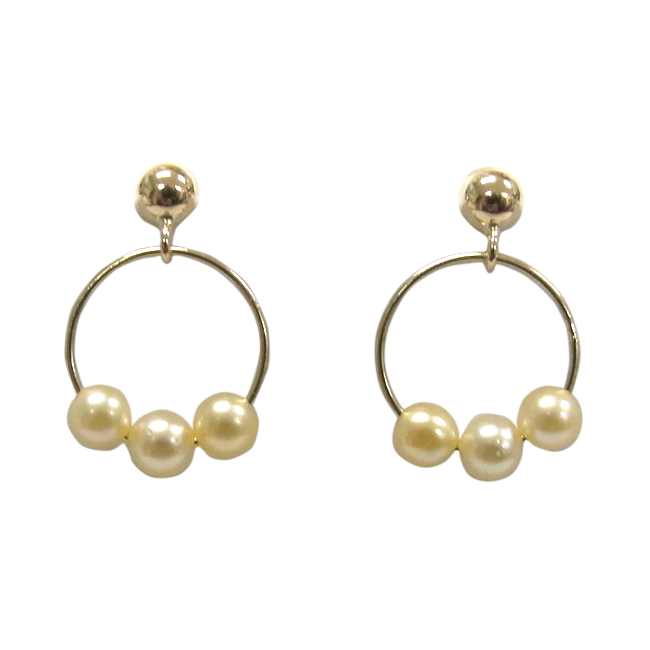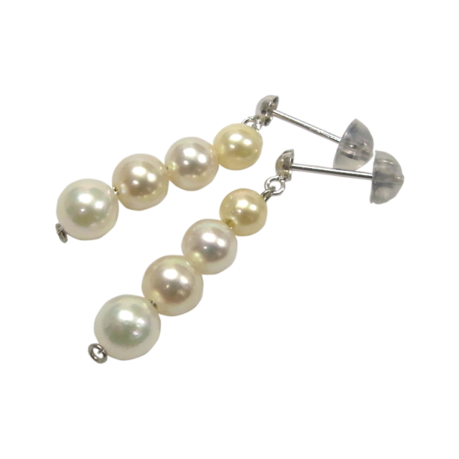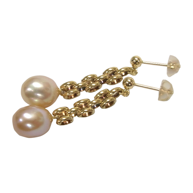 淡水のパールネックレスをばらして棒状につなげて作ったイエローゴールドピアス