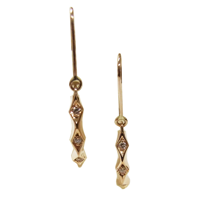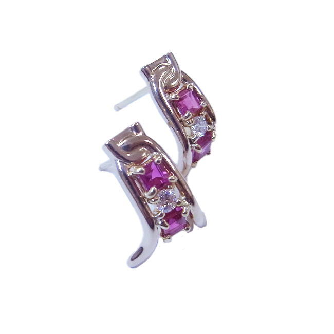 イエローゴールドフレームのメガネのつる部分にあったルビーとダイヤの飾りをそのまま切り出し加工してピアスへ