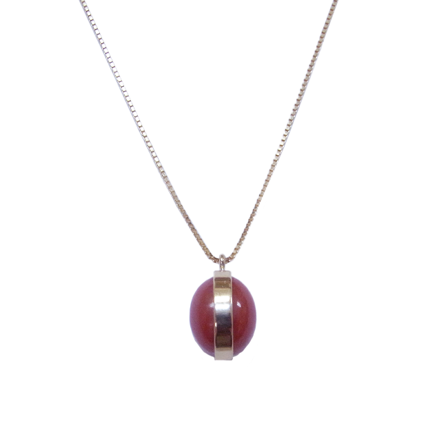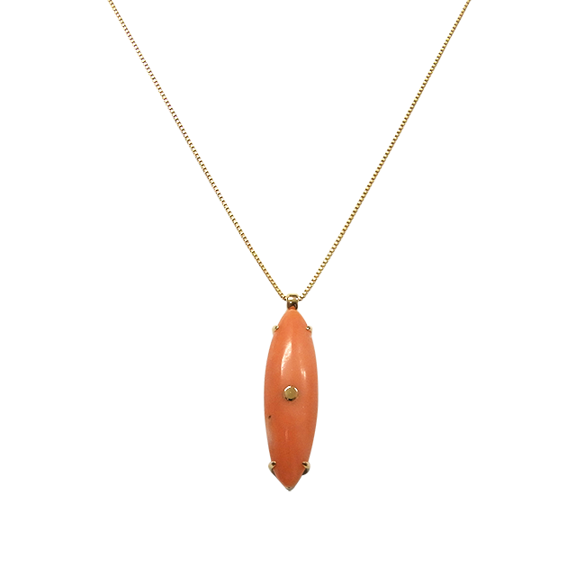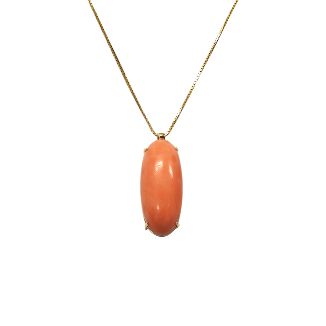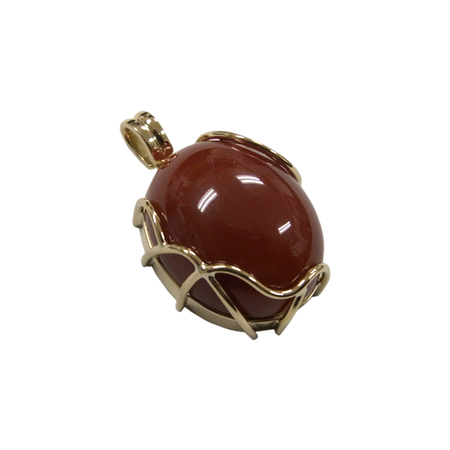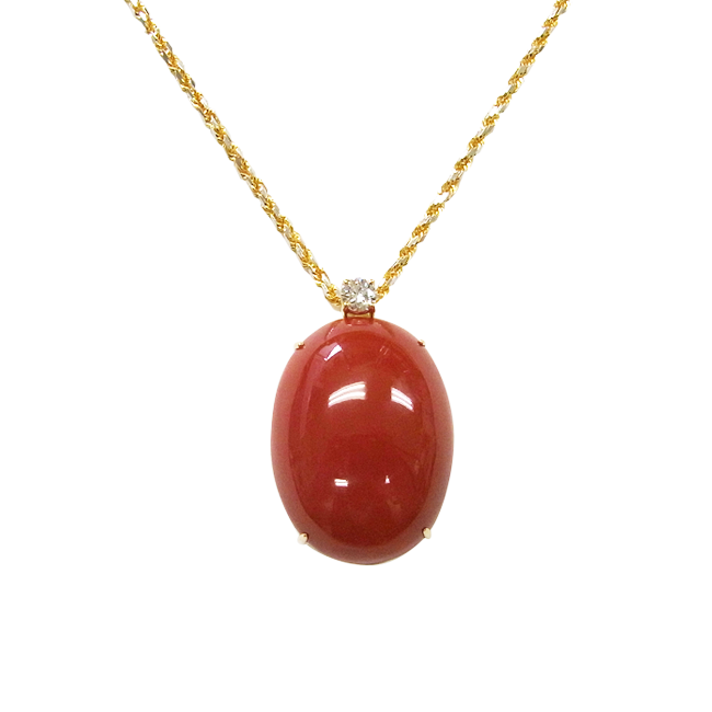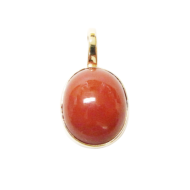 お客様がお持ちだったカボションカットのサンゴのルース(裸石)を2つ貼り合わせてイエローゴールドペンダントへ