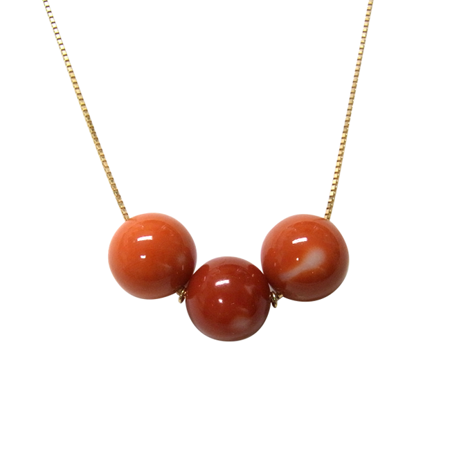 サンゴの丸玉としずく型の間にチェーンを入れてデザインをマイナーチェンジ