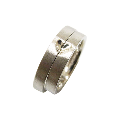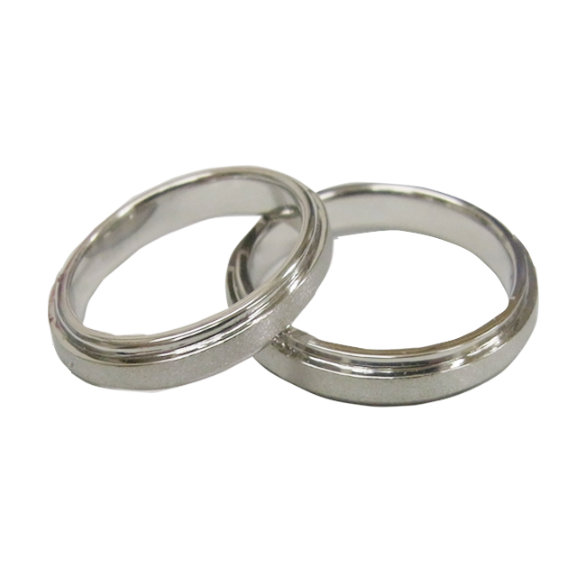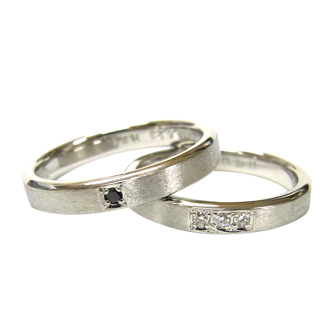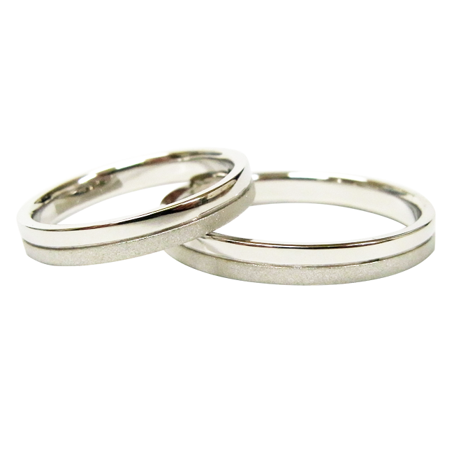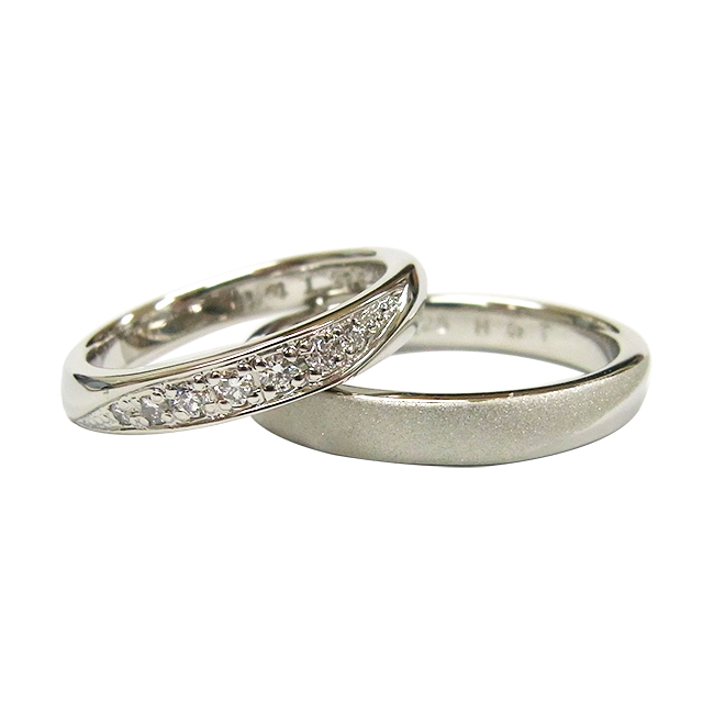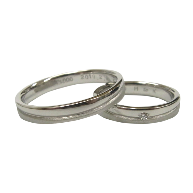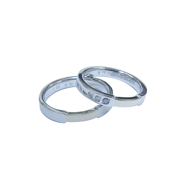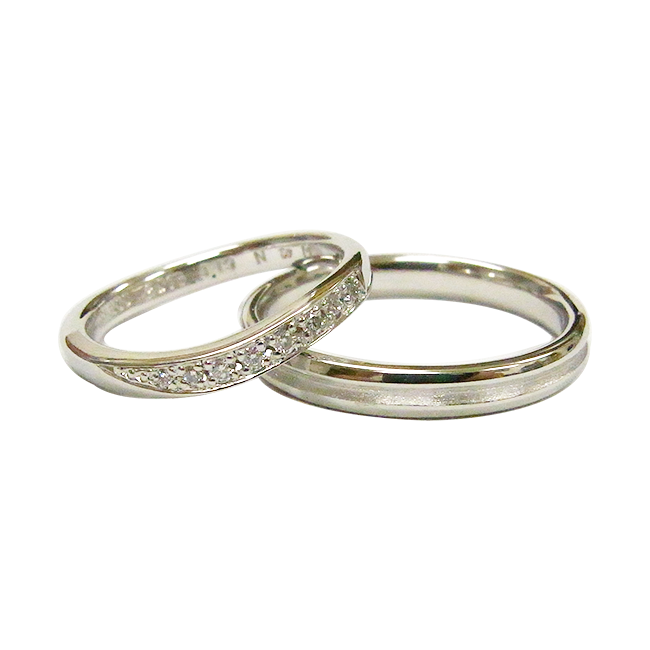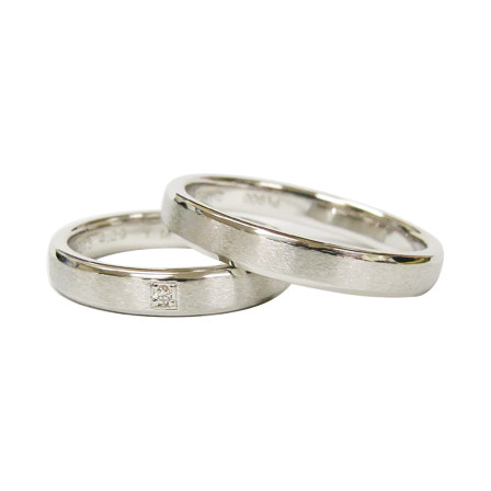 男性はポリッシュ(光沢)とサテン(つや消し)のツートンデザインに、女性は同じベースで男性のサテン部分にダイヤを入れたペアリング
