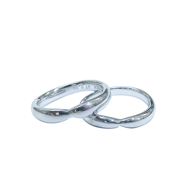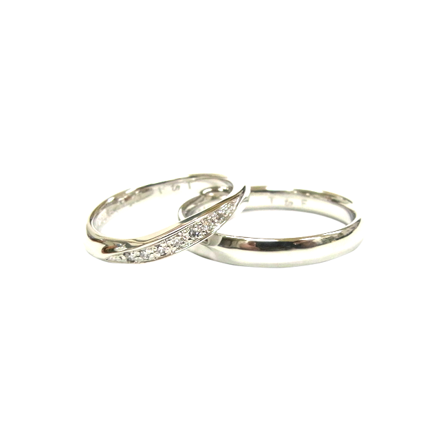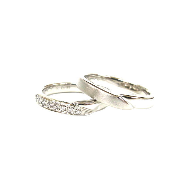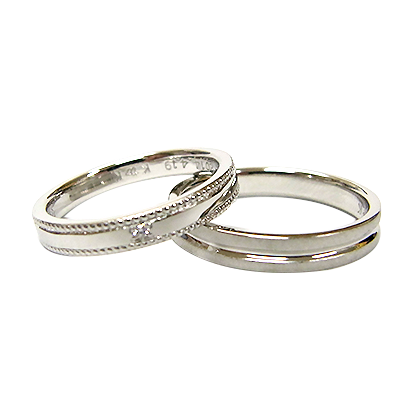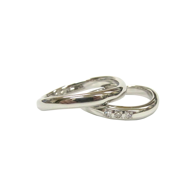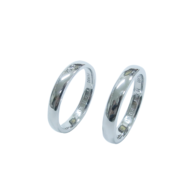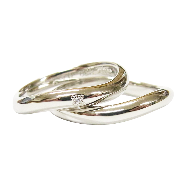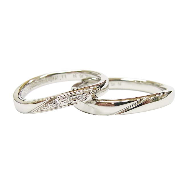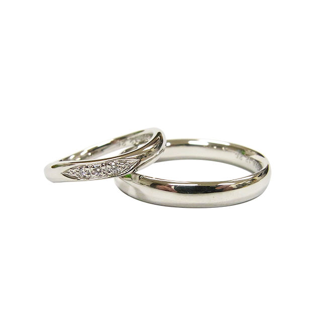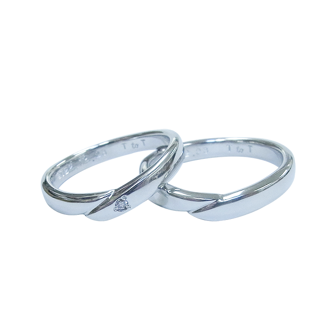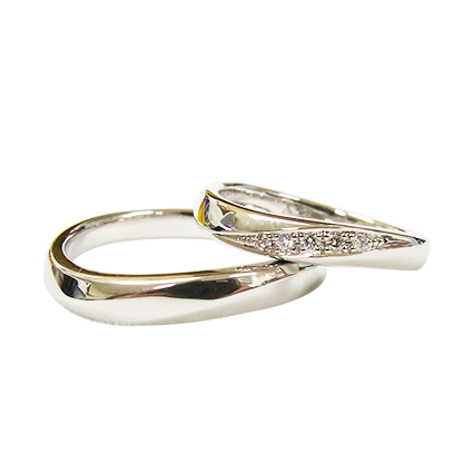 男性はシンプルに、女性はダイヤ入りで曲線を描くデザインのマリッジリング