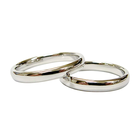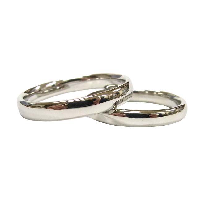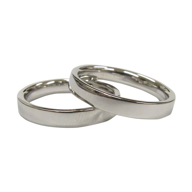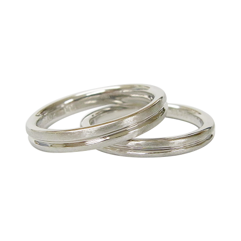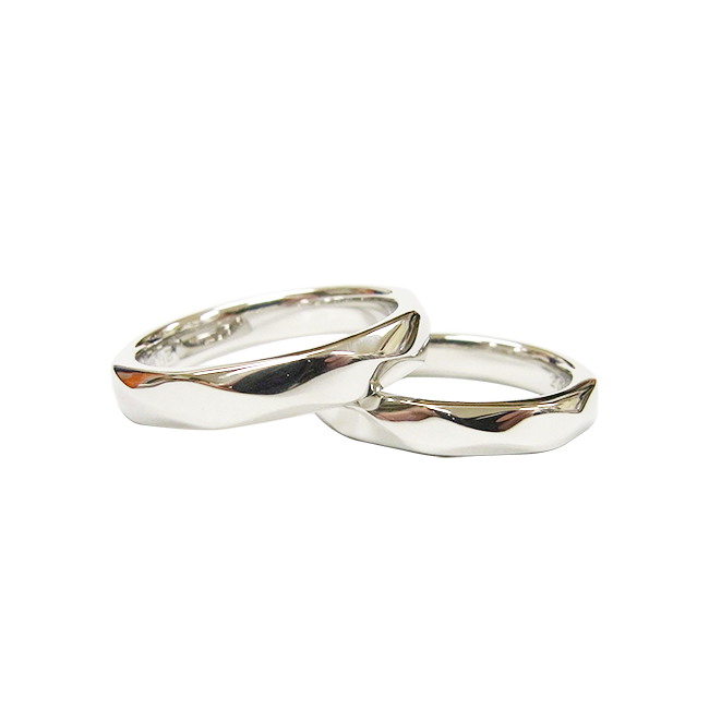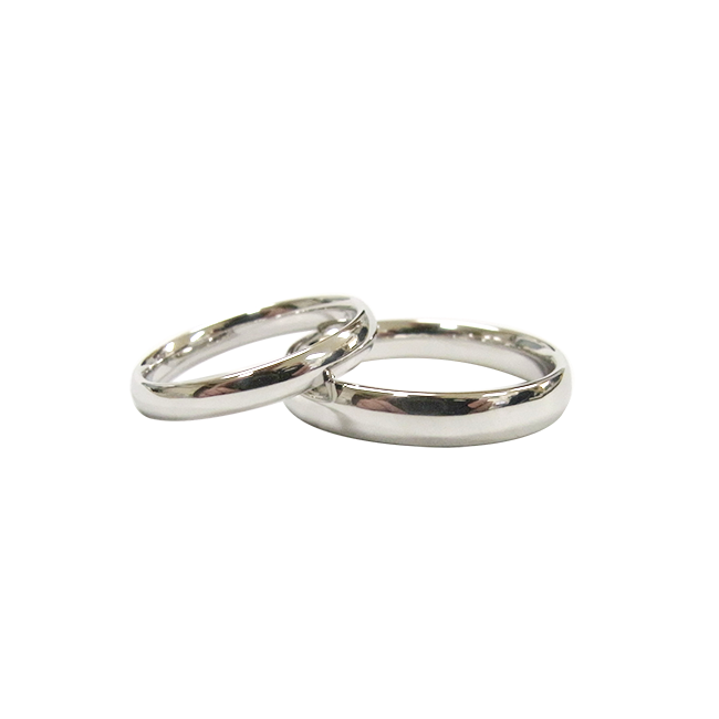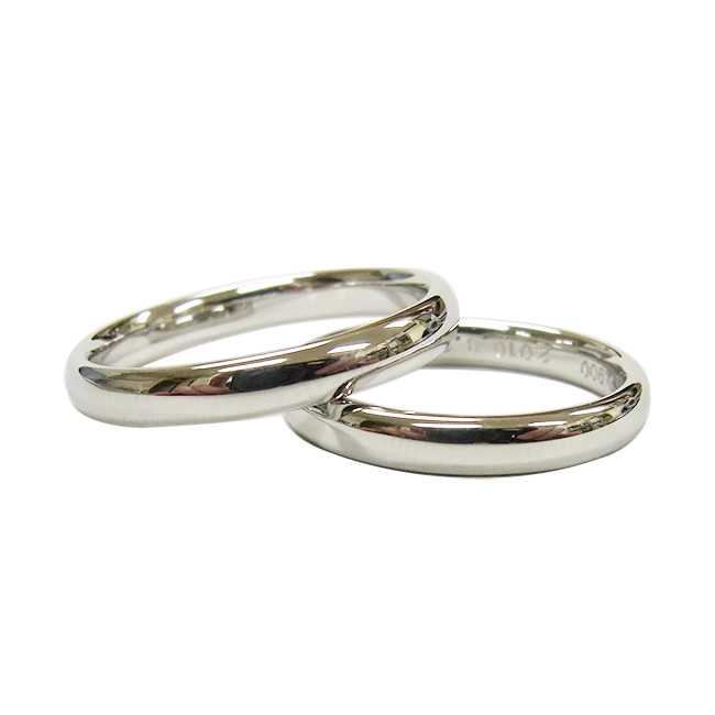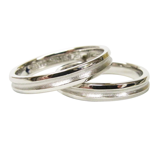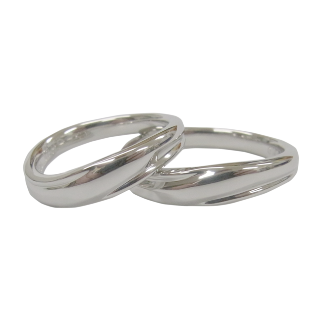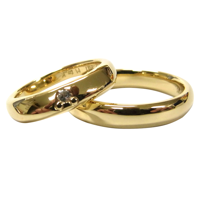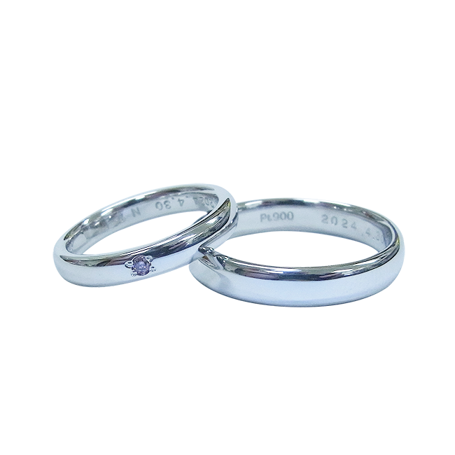 男性はシンプルに、女性はダイヤ入りで曲線を描くデザインのマリッジリング