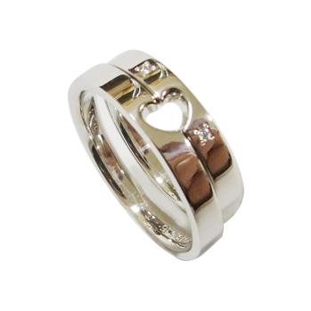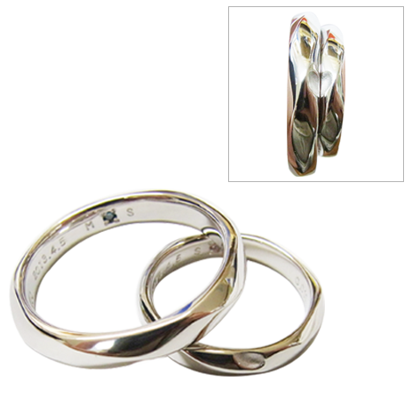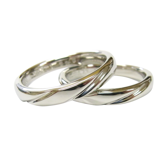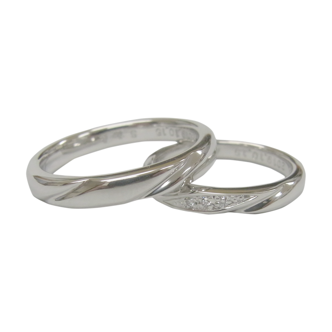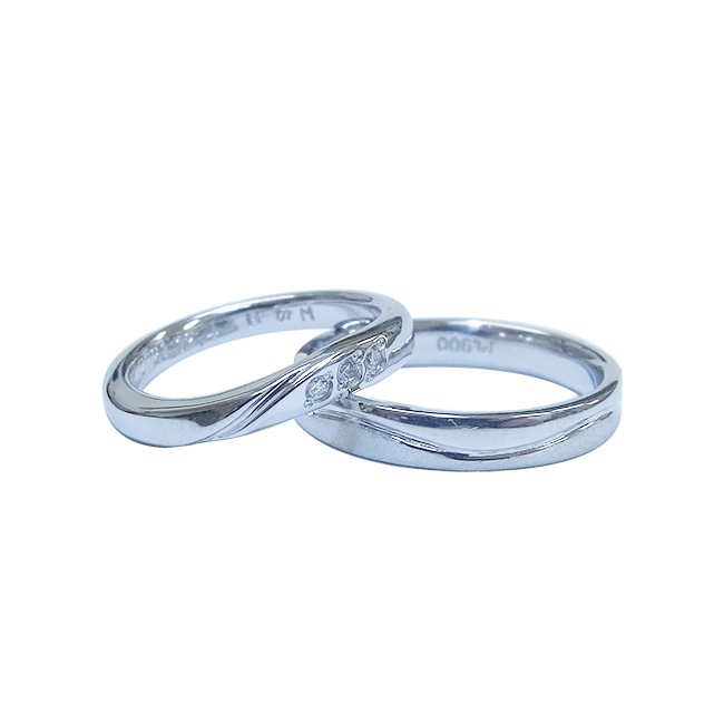 シンプルな甲丸リングにひねりが入った定番リング。女性の方は3石のダイヤが埋め込んでいます。