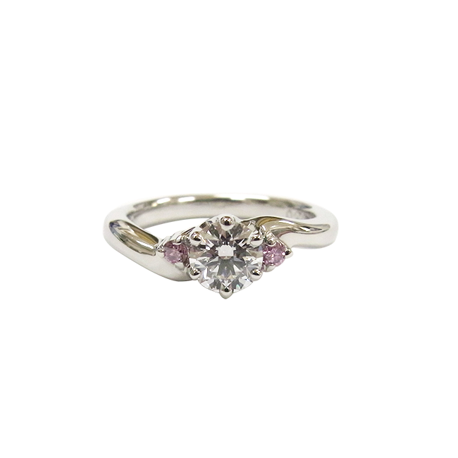 センターのダイヤに負けないぐらいの存在感のある濃いピンクダイヤが特徴的なエンゲージリング