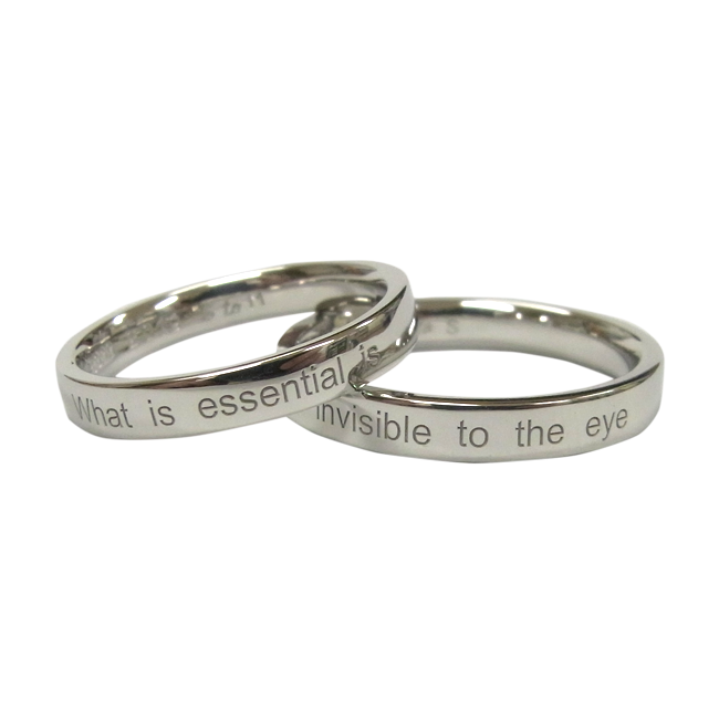 リング表面に「星の王子様」の原文の一節をレーザー刻印し、2つ合わせると文章がつながるマリッジリング