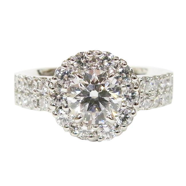 こちらのエンゲージリングは、大きなダイヤを使って華やかな感じにというご依頼でしたので、センターにはエンゲージリングとしては大き目の0.7ctのダイヤを使用し、その周りをダイヤで取り囲み、さらに両サイドの腕部分にもダイヤを2列3石づつ並べました。