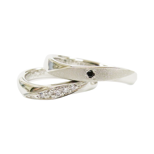 奥様のリングではダイヤの数や微妙な腕のひねり具合、旦那様のリングでは奥様と同じデザインを活かしつつリングの幅を少し広げ、ダイヤが入っている部分をつや消し仕上げにして真ん中にブラックダイヤをポイントに入れました。